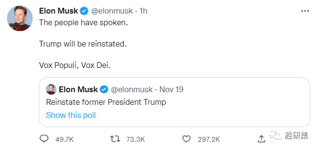 昨日,马斯克在推特上发起了一个投票,让互联网自己选择是否恢复特朗普的账号!