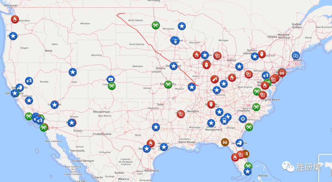 胜研在红蓝形势图上标出了一些红色州中,民主党中心城市发骚乱的城市: