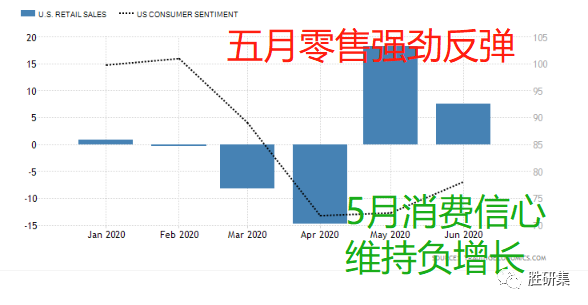 美国的零售数据也支持这个逻辑,5月在救济资金到位的情况下,零售开始强劲反弹,但是到了6月,反弹速度开始放缓。