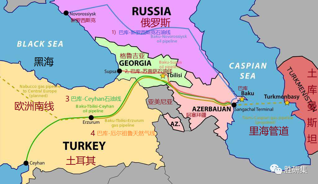 高加索本地产石油,由此通过管道输送到邻国格鲁吉亚和土耳其,再从土耳其出海到地中海,然后出口到世界。