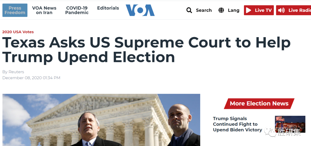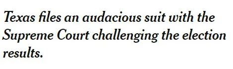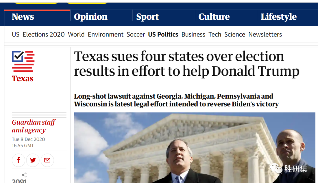 12月8日周二,美国得克萨斯州(Texas, TX)针对四个摇摆州,乔治亚州(GA)、密西根州(MI)、宾夕法尼亚州(PA)和威斯康星州(WI),在2020年大选期间以新冠疫情为理由改变大选选举流程的做法,向最高法院发起诉讼。