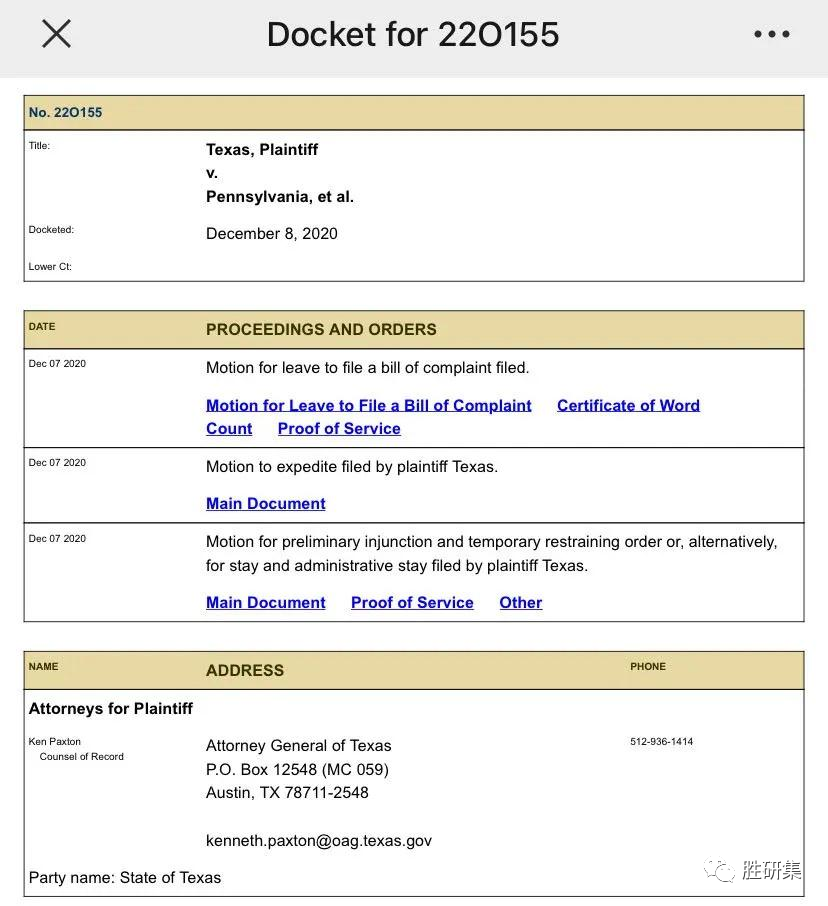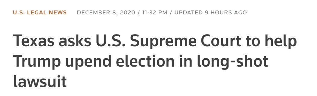 官司由德州共和党司法部长肯·帕克斯顿(Ken Paxton)向美国最高法院提起,要求废除宾夕法尼亚州,乔治亚州,威斯康星州和密歇根州的总统选举结果。