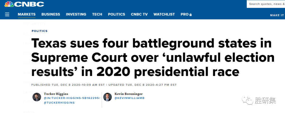 德州要求高等法院裁定:“不计算这四个摇摆州的‘选举人投票产生的总统大选选举团票’。”