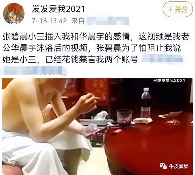 更“污”的是,一位叫“发发爱我”的网友,还发文说张碧晨小三插入了她和华晨宇的感情,并配上了“纯情男孩”沐浴后的样子。
