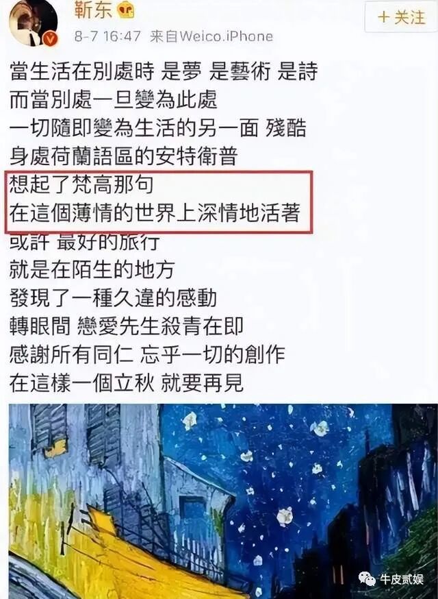 靳东写诗时,会引用名言,比如用梵高说的那句“在这个薄情的世界上深情地活着”,可梵高老哥,似乎并没有说过这句话哦。