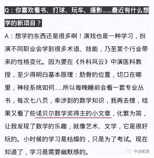 比如,靳东说自己会在睡前看一套专业的丛书,每次七八页,牵涉到的数学知识,会去看诺贝尔数学奖得主的小文章,从而发现数学的乐趣。