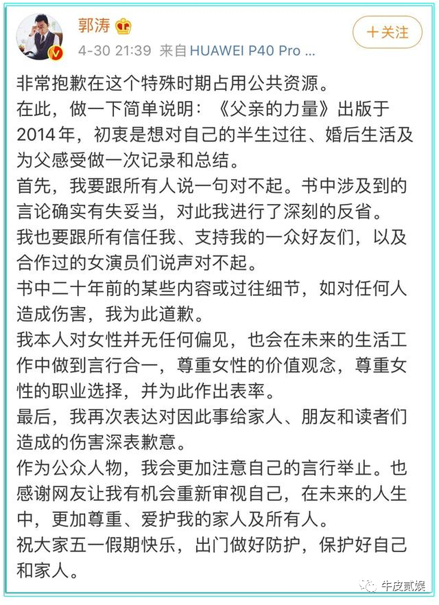 随着舆论越来越大,郭涛也意识到了自己语言上的不妥,最终不得不发文道歉,至此好丈夫、好爸爸的形象,再也一去不复返。