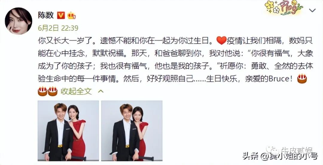 2022年6月2日,陈数在社交平台上为大象庆生,一家人虽然远隔重洋,但陈数字里行间,都能感受到陈数对于儿子的爱。