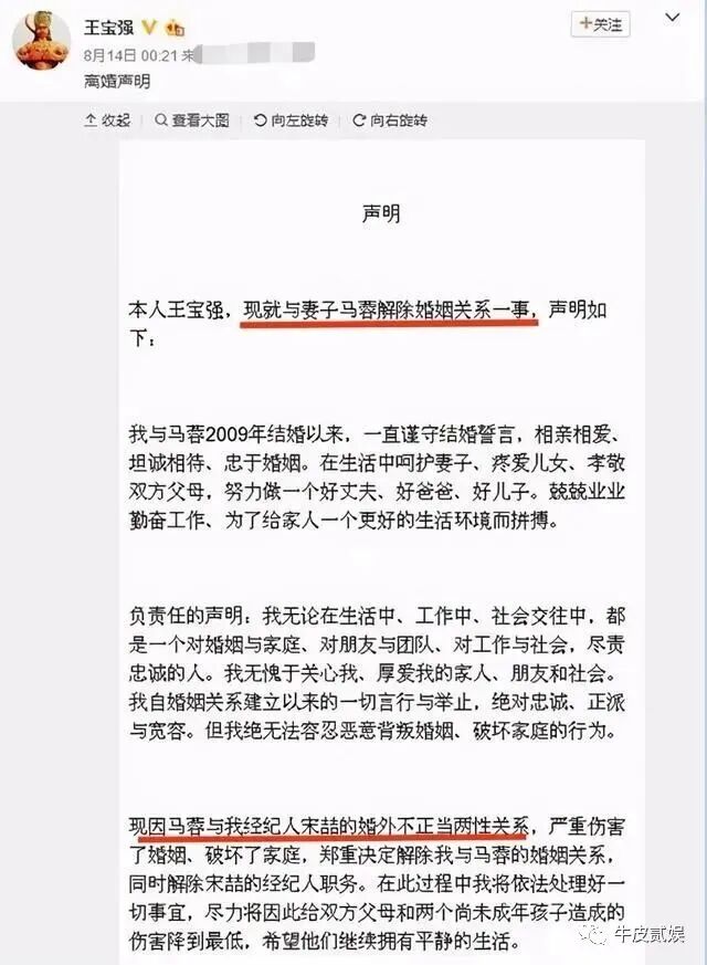 也是这一年,他在社交平台发布离婚声明,曝光妻子马蓉和经纪人宋喆发生不正当性关系。