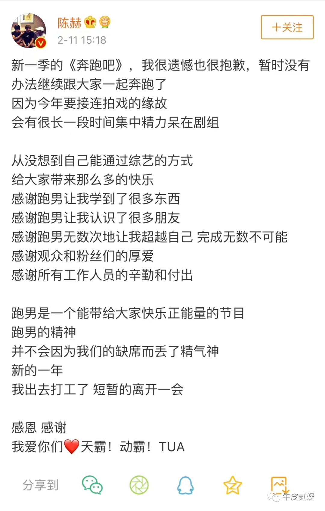 2018年,陈赫和邓超一起,宣布退出跑男,给出的理由也是拍戏档期不合,会有很长一段时间集中精力待在剧组。