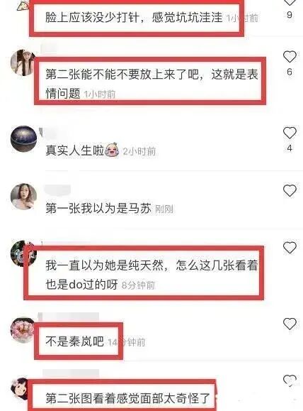 引起网友热议的是第二张图,因为在这张图里秦岚的脸部似乎有打针的痕迹,胶原蛋白也流失不少,与心中的“白月光”形象相差甚远。