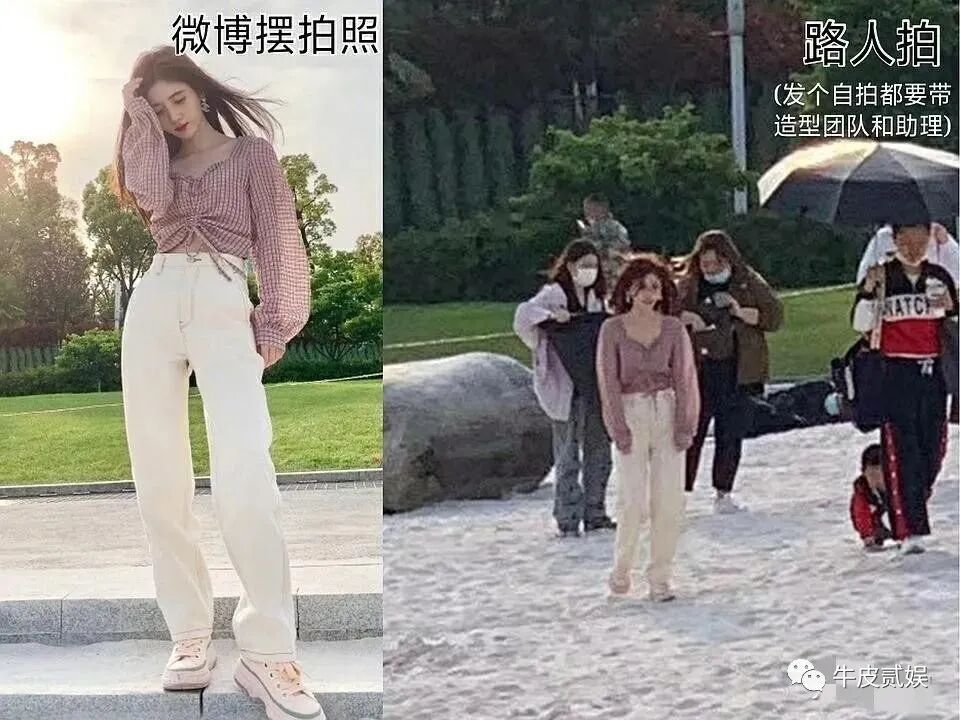 迪士尼乐园的那组照片,微博摆拍照精致高挑大美女,路人照就是平平无奇的路人甲。
