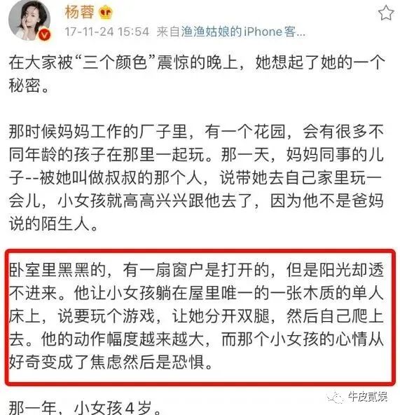 2017年,幼儿园疑似虐童事件震惊全网时,她在社交平台上以第三人称的方式,讲述了小时候遭遇猥亵一事,呼吁大家保护孩子。