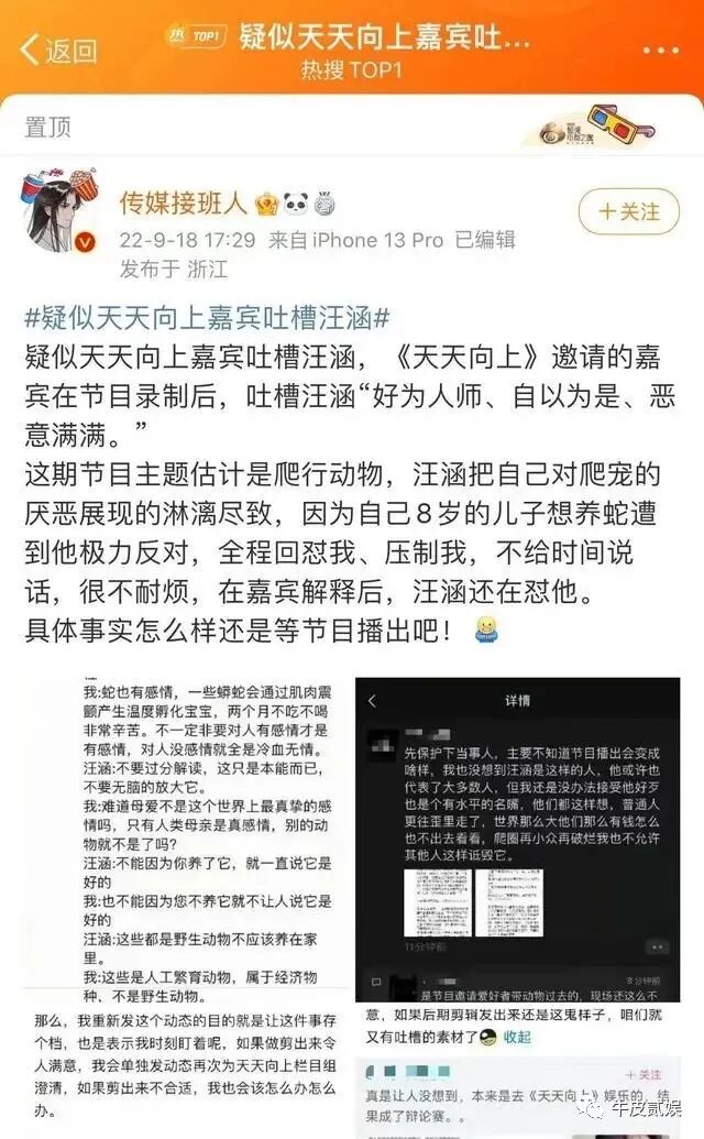 而让他人设直接崩塌的可能是被《天天向上》某嘉宾的吐槽,这位嘉宾在网上发帖吐槽,他称汪涵在节目中把对爬行动物的厌恶表现得淋漓尽致。