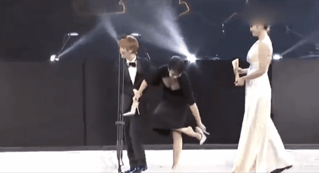 不知为了照顾郭敬明的身高,还是暗讽郭敬明的身高,海清当众脱下高跟鞋,光着脚为郭敬明颁奖。