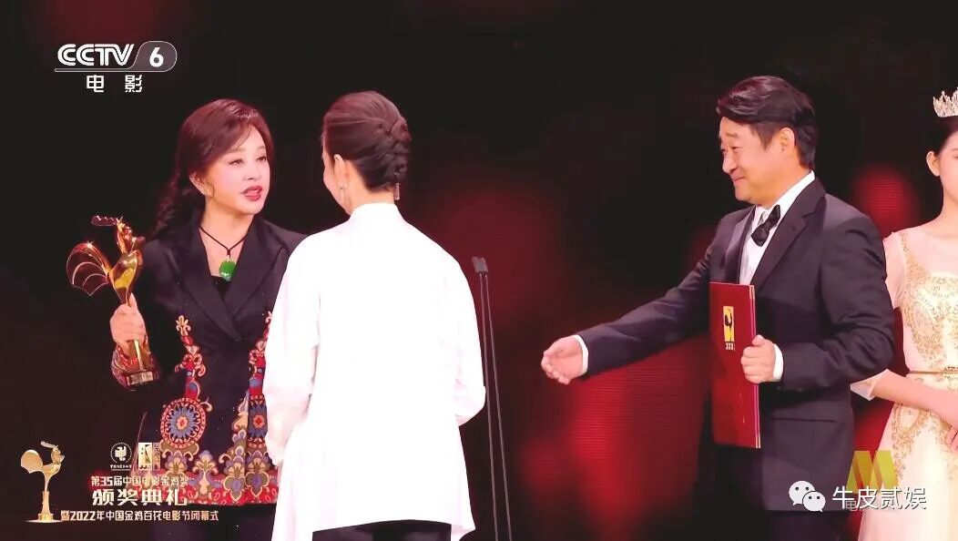 明明是奚美娟的主场,刘晓庆却稳站C位不动摇;手里还死死攥着影后奖杯,有一种她获奖、奚美娟给她颁奖的架势。