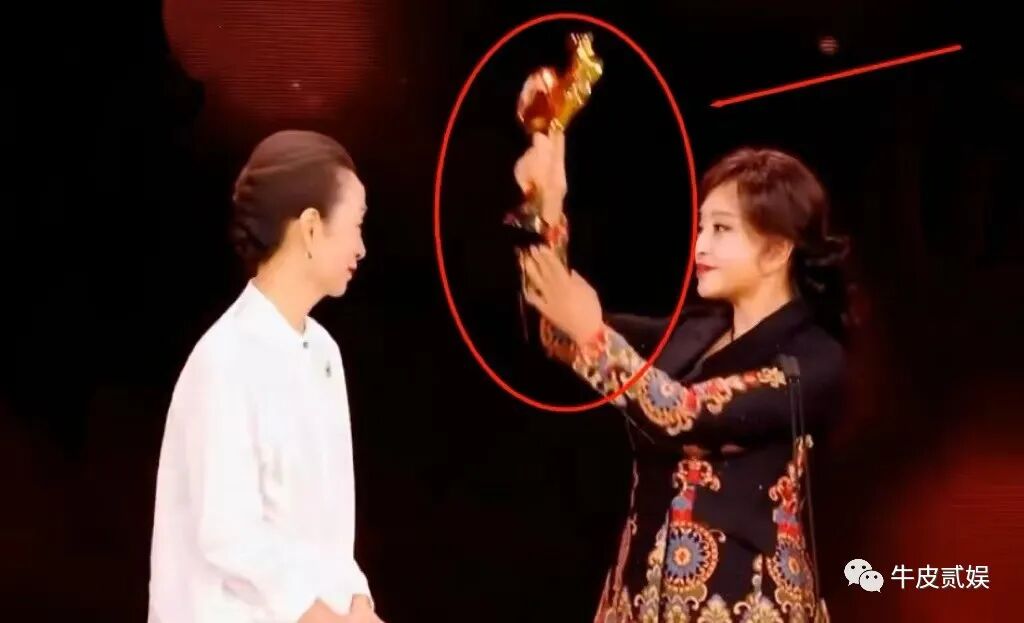 只见刘晓庆高高举起奖杯,一度举过头顶,这样的现象真是“活久见”,颁奖人一般以比较舒服的方式递奖杯,包含着祝贺、尊重等多层含义。