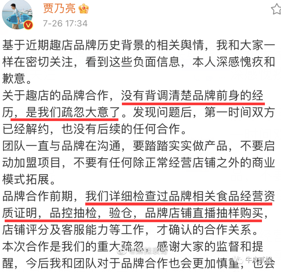 事后,网友们对此表达了不满,而贾乃亮的解释却是“没有调查清楚品牌方的背景,是我的疏忽大意”。