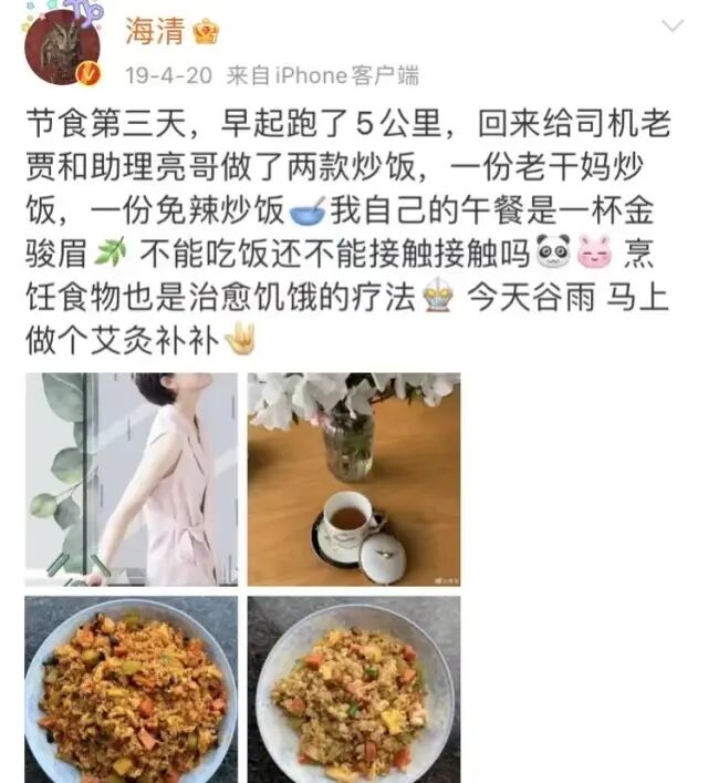 海清的社交平台也是处处可见养生的痕迹,她不仅节食辟谷,还做艾灸。
