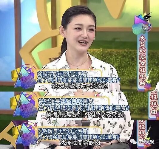 就当大S表达想要怀孕生子的意愿后,网友指出改掉吃素的习惯,增加营养,包括她婆婆张兰,也觉得她太瘦,好言相劝适当吃肉。
