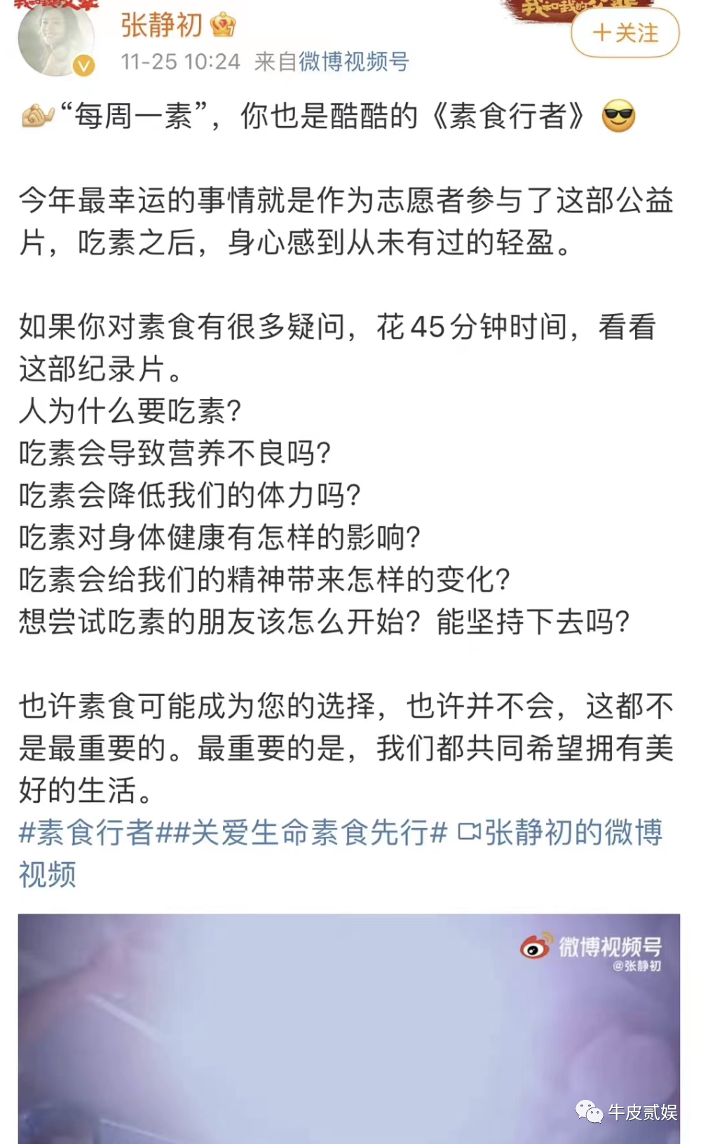 在纪录片《素食行者》中,张静初说吃素让她感到身体轻松,号召大家一起吃素。