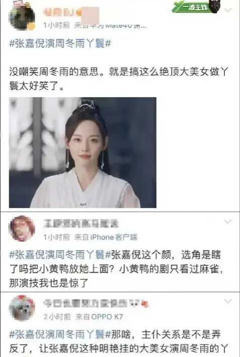 扮相也是惨遭配角张嘉倪艳压,明明人家演的是女主丫鬟,但存在感却是压倒性的战胜女主。