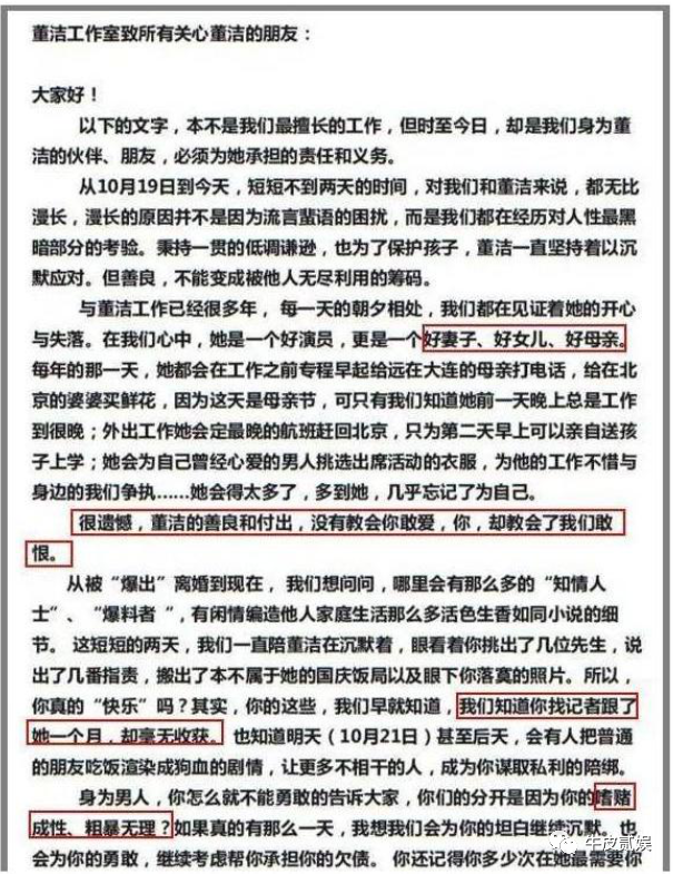 根据这篇公告的表述,董洁完全是这场婚姻的“受害者”,是潘粤明的嗜赌成性,粗暴无礼才让董洁选择离开。