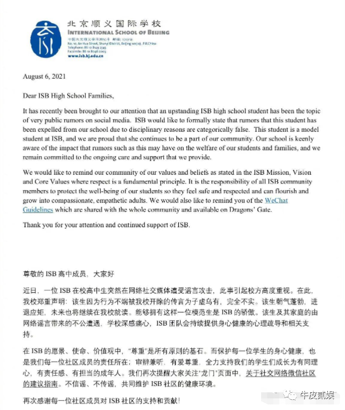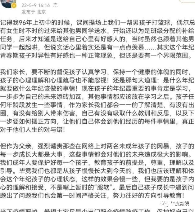“其实青春期的孩子对异性有好感也是正常的现象,但还是要有一个界限范围。教育孩子的前提是尊重、理解以及引导,毕竟我们也是从那个时期走到今天的,也请大家停止对两名未成年孩子的网暴。”