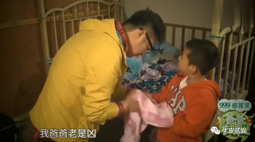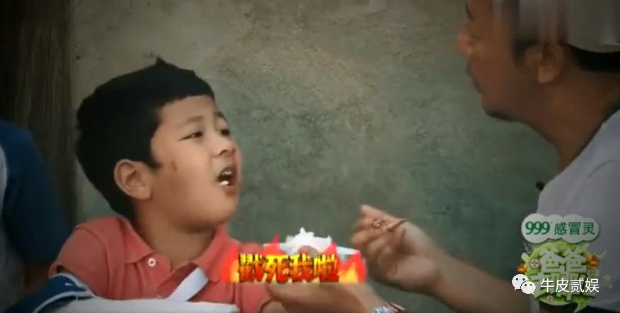 因为手臂不方便,每次吃饭都是郭涛给他喂食。结果爸爸动作粗鲁了点,他就大咧咧吐槽:“戳死我啦!”