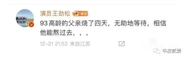 母亲的突然离世,并没有让王劲松的“痛苦”结束,因为他93岁高龄的父亲已经烧四天了,作为儿子的他只能无助的等待,相信父亲能熬过去。