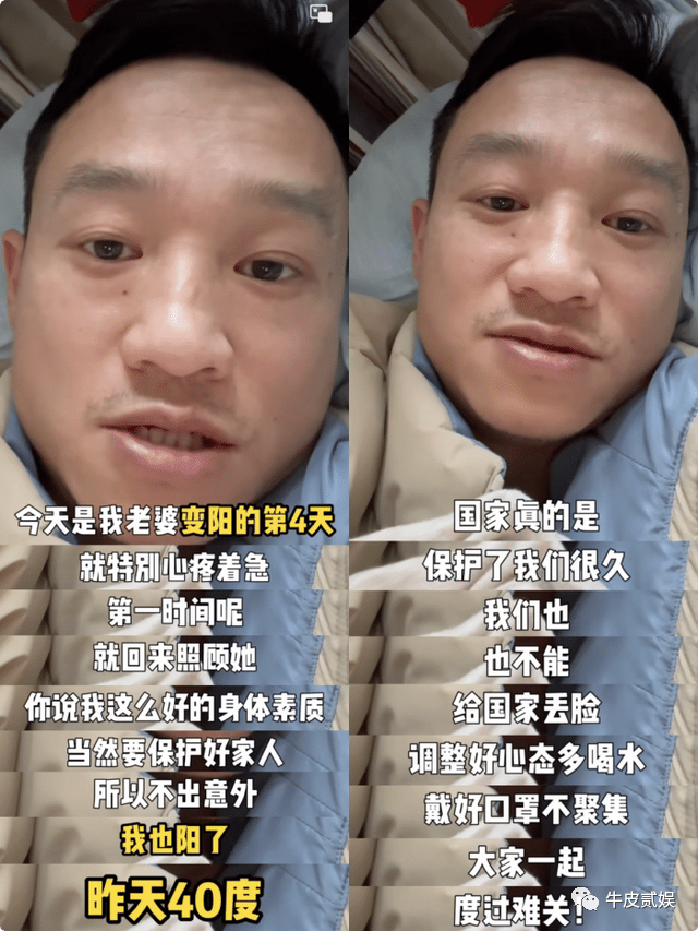杨威称:他们家先是他媳妇中招,而他在照顾媳妇的过程中,不幸也被感染了,但此时他媳妇还没有完全康复,于是这两口子也不再避讳什么了,就一起抱团取暖,共同抵抗病毒。