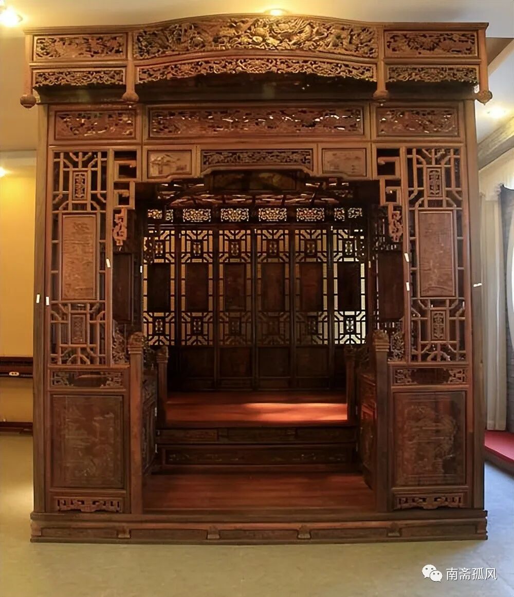 架子床在清朝尤为盛行,这张龙床的床身用4个架子相互围成,还有封顶,只留一面用来使用。