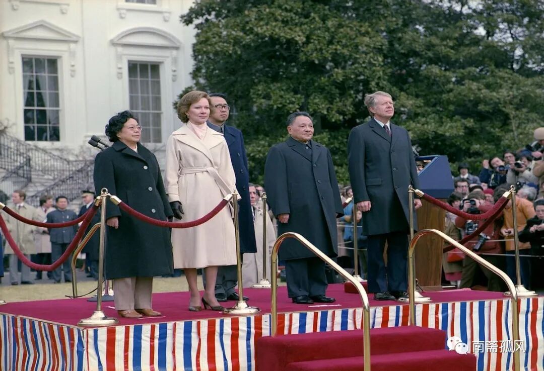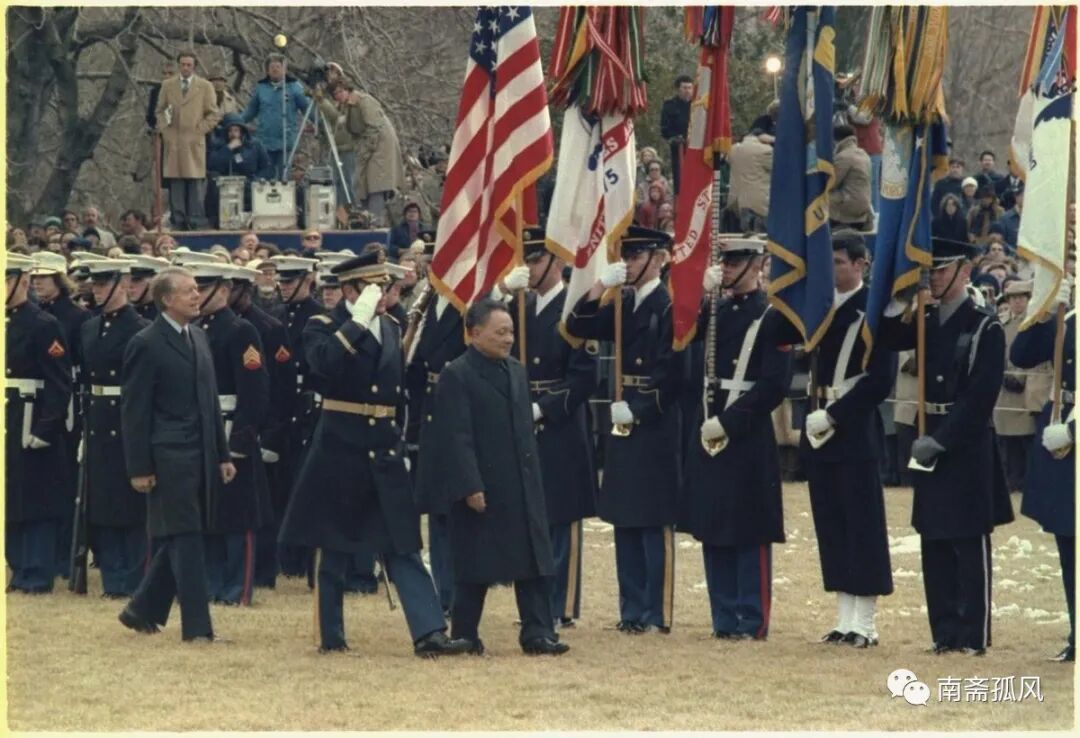 1月29日上午,在白宫南草坪上,高举中国国旗的美国海军陆战队员,在卡特为邓小平举行的隆重欢迎仪式上,接受了他的检验。这是一个激动人心的时刻。