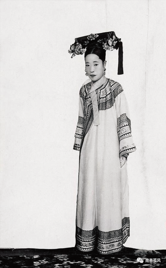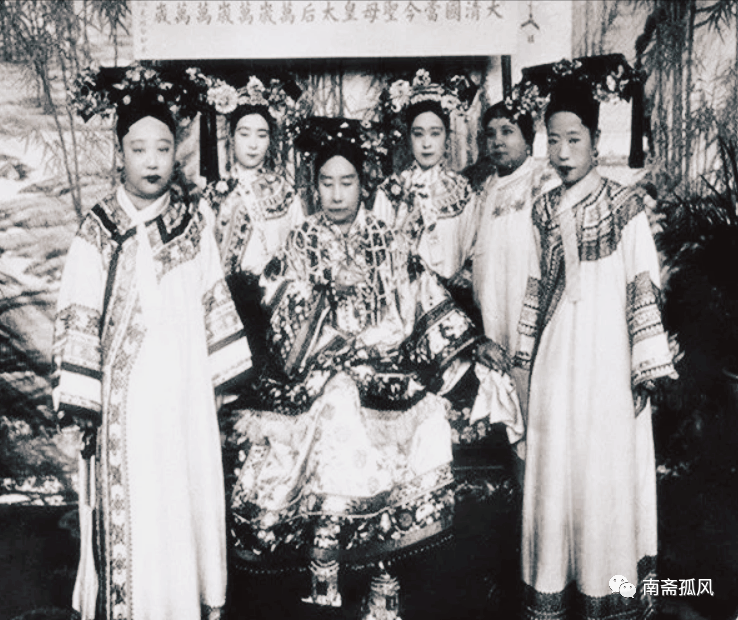 图中皇后穿着清朝典型的服饰,带着满头珠翠,站在那里。