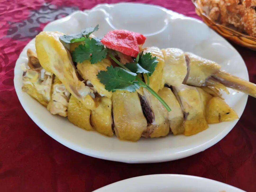 江西人的宴席上也爱吃白切鸡,在摆盘时放了一根芹菜叶子和一小块油炸的红豆腐,这样的摆盘让人看起来有点太寒酸,太随意了。