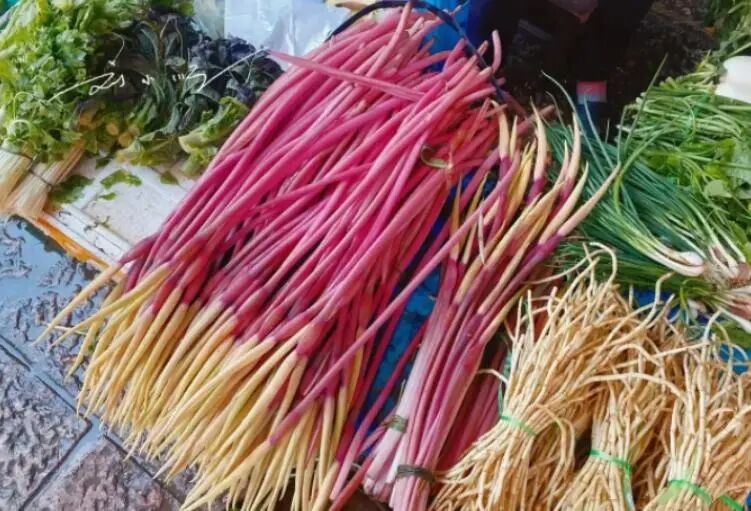是当地的特色蔬菜,这种蔬菜是水生植物,上面发芽的是叶子,下面是根茎,人们吃的是根茎部位,搭配猪肉,牛肉,鸡肉一起炒,非常的下饭,很受当地人的欢迎。