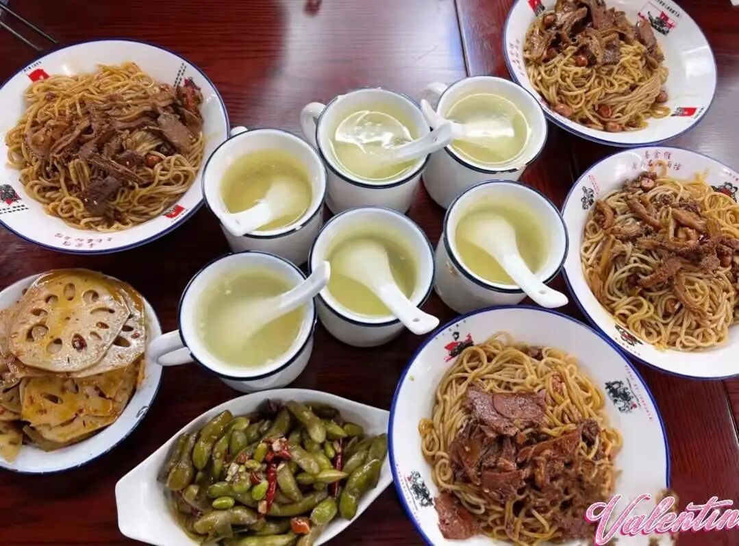 吴登进第一次来南昌,自然不知道该吃点啥,看到每一桌都有一个茶杯,于是便对服务员说每个人来2杯,听说江西粉丝很出名,于是点了3道牛肉炒粉,又点了毛豆莲藕等6个菜品。