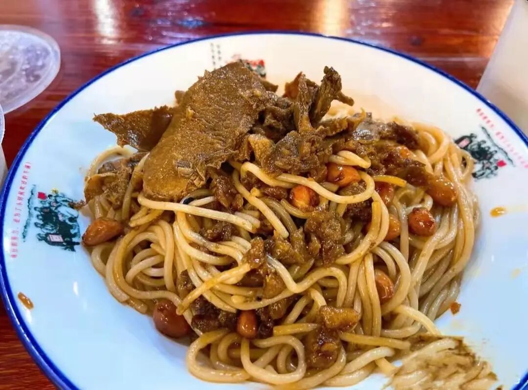 江西的牛肉炒粉跟东北的完全不一样,江西人爱在炒粉里放入花生米,酸菜碎末,加入辣椒粉,看似不辣的牛肉炒粉,吴登进品尝一口后发现,辣味太足了,还好有肉饼汤,要不然这碗牛肉炒粉没法吃了。
