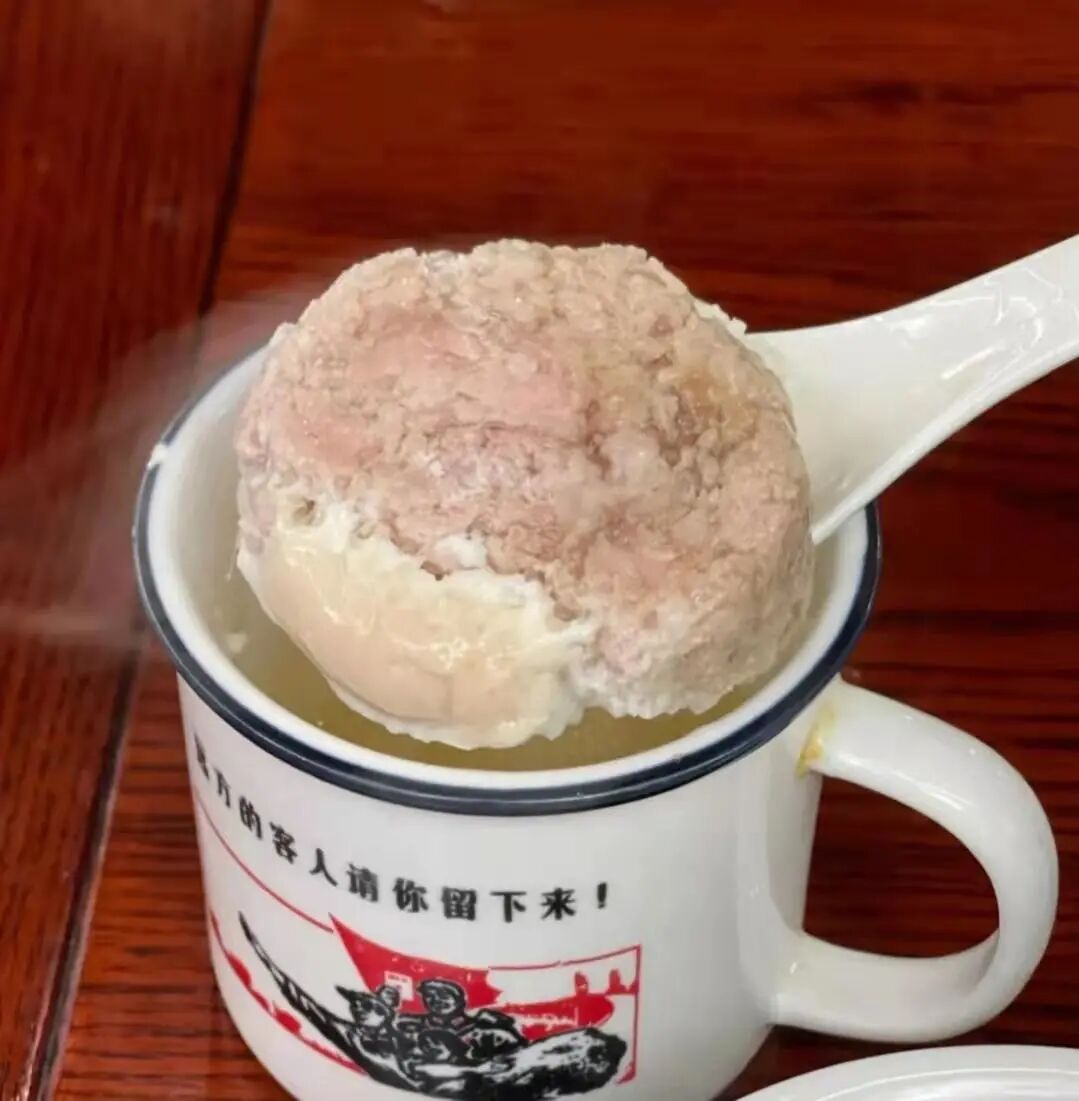上桌后吴登进才发现茶杯里面装的不是茶水,而是肉饼汤!