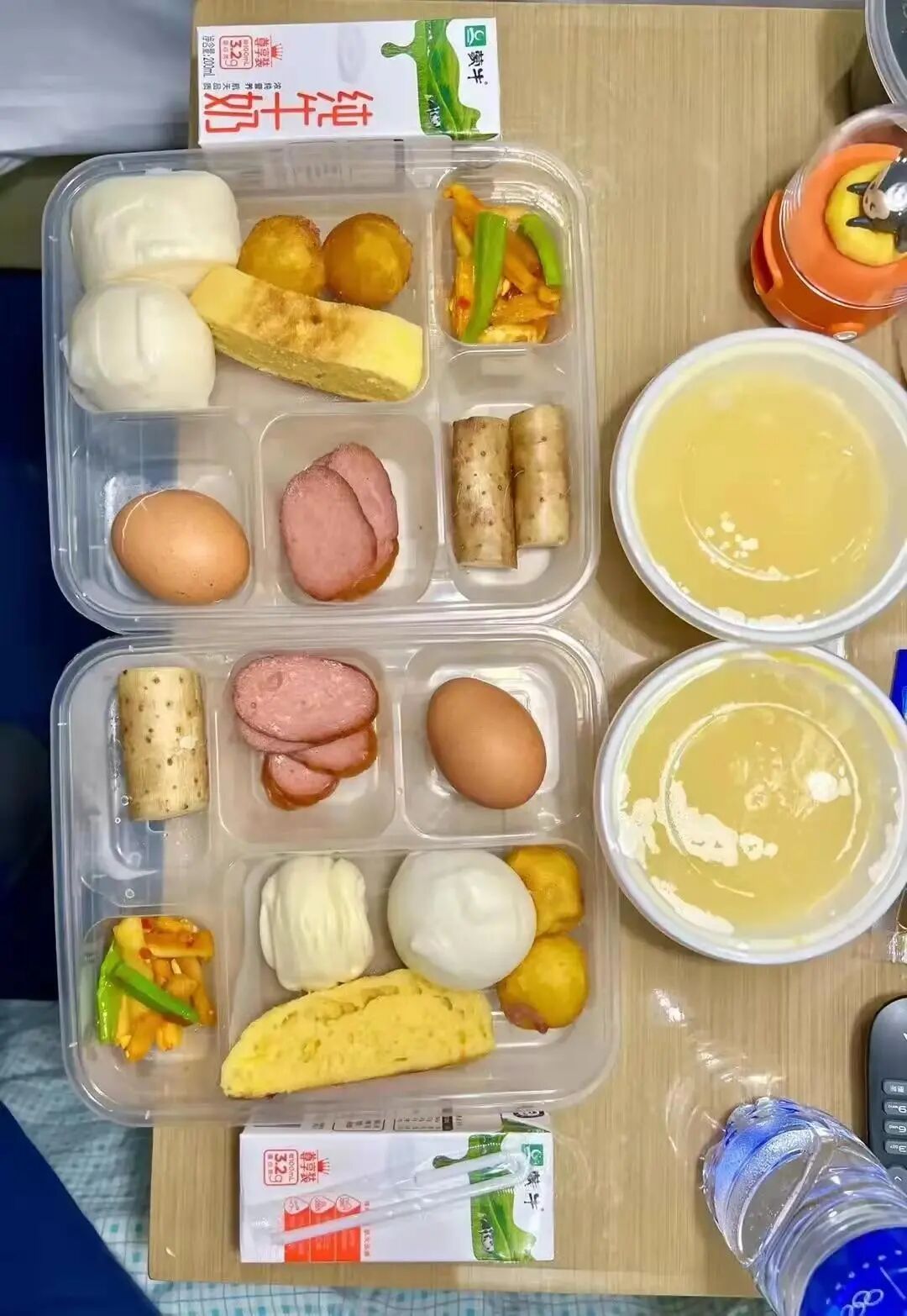 早餐的隔离餐菜品很是丰盛,两根水煮山药,一个水煮蛋,四片火腿,一个包子,一个馒头,还有一个面包,两个丸子,一份泡菜,一碗小米粥,一瓶纯牛奶。