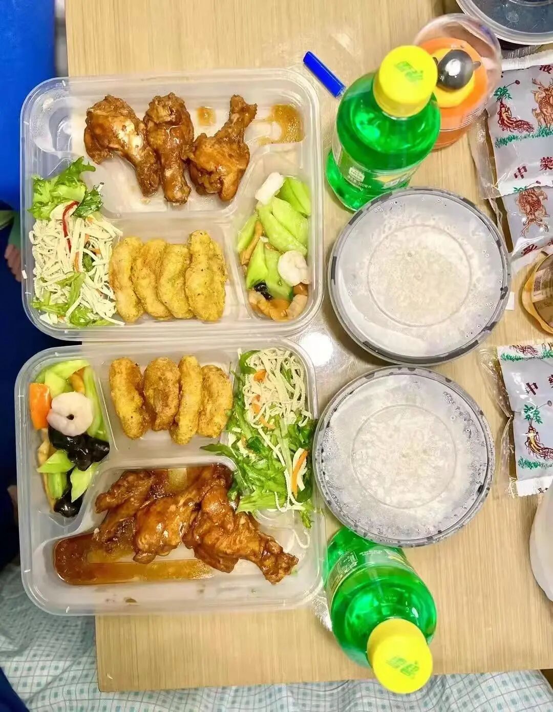 有时候隔离午餐吃得更丰盛,一个人3个鸡腿,4大块炸鸡块,一份豆干,一份黄瓜虾仁黑木耳小炒菜,一大碗米饭,一大瓶雪碧。