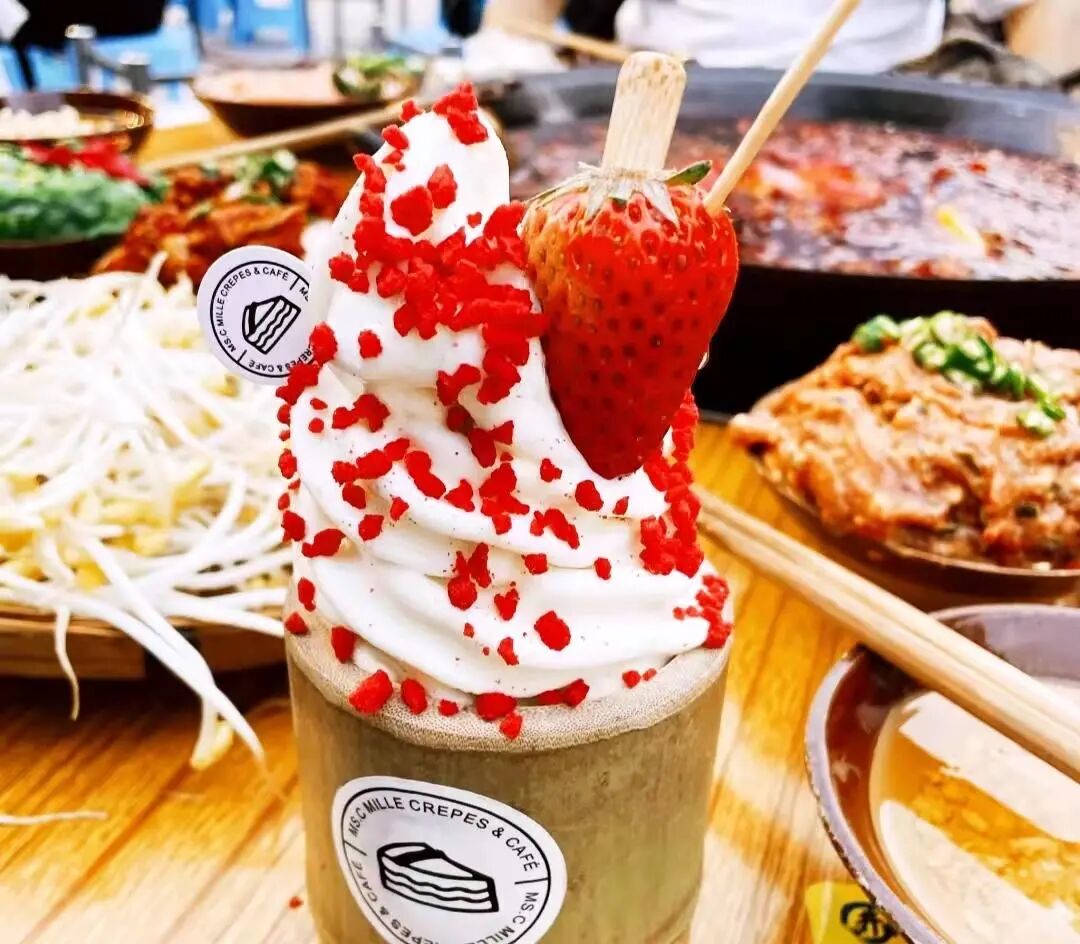 实在是太辣太麻了,幸好四川朋友提前准备了一个竹筒冰淇淋,刘新荣直接拿了起来一口咬了下去,冰淇淋带着浓浓的奶香味,草莓香气和冰凉的奶香味二者混合在一起,沁人心脾。