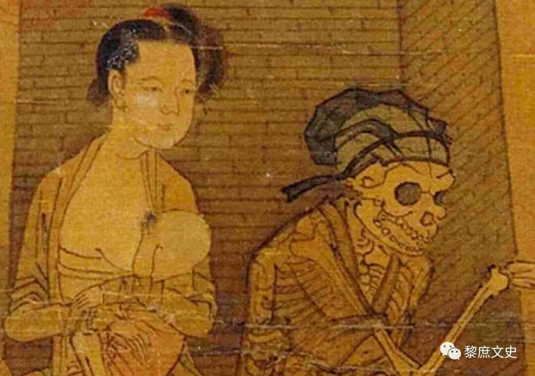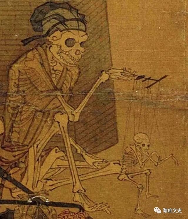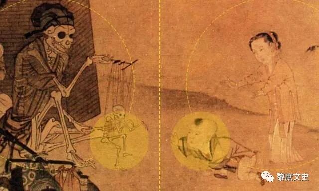 有人说,画中的骷髅有可能是黄公望,因为他就是一名傀儡手艺人,他经常以街头卖艺为生,带着妻儿居无定所的四处漂泊,这是他的心路历程的具象化。 这个说法,似乎也很符合李嵩一向的写实画风。 当然这个说法,有人认同,也有人反对。反对者持有的意见是:既然是现实题材画作,那为何不直接画黄公望本人呢?而要将黄公望画成一具骷髅呢? 也有人说,《骷髅幻戏图》这一张画中,有生有死,骷髅意味着死亡,小孩子象征着生命,妇女去阻止小孩接近骷髅头,是阻止孩子接近死亡。 但也有人说,如果是妇女是阻止孩子接近死亡,为何她的脸上没有惊恐的表情呢?反而从画面的整体中透出来的是一种祥和的气氛。 《骷髅幻戏图》创作于宋元时期,这个时期,一种习见的隐喻方式就是骷髅,而道家的齐物、乐死,佛家的涅槃,都是骷髅幻戏的思想渊源。因为这种比喻逐渐被遗忘,所以会让后人感到诡异。