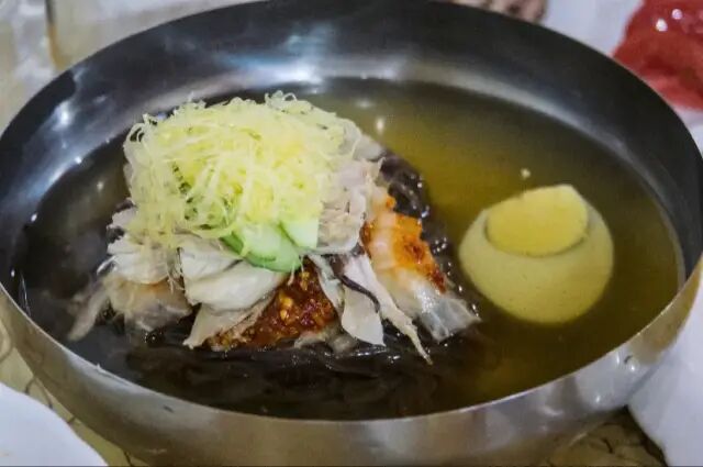 朝鲜冷面,每碗人民币30元左右,看样子好像和国内的差不多。但除了“冷”,真的没吃出什么味道!完全没有国内的酸甜口感,也不咸不淡的。
