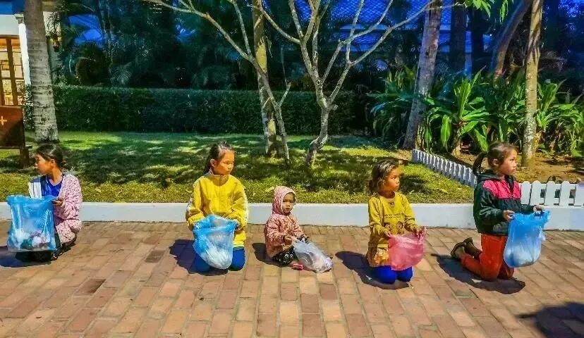在布施仪式中,有一类特殊人群,就是当地的贫苦家庭,他们无法给予,只能让孩子拿一个塑料袋在路边,当僧侣们路过时,会将化缘得来的部分食物分给孩子们。