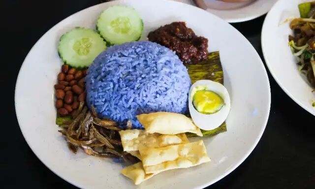 3、马华人不吃猪肉,和各种动物的血液。马来人吃饭是用右手抓食,不用左手,认为左手不洁。马来菜给我的印象不深,记得有一道蓝色椰浆饭,在当地名气挺大,米饭是蓝色的,我起初以为是什么新品种的大米,后来大马华人告诉我,这是用蓝花的水煮的。