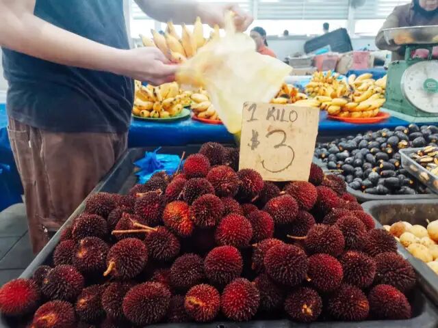 7、果蔬。文莱的热带水果种类不少,红榴莲没赶上,不知道味道怎么样。白榴莲一个2斤重,5文元能买2个,果肉新鲜饱实,味道浓郁,要数黄榴莲较便宜,一文元一个。龙根果和当地产的一种外皮很软,果实类似于山竹的果子也很好吃。
