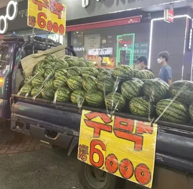 瓜农开车在路边卖的西瓜,一个约为30元人民币;商超里的水果确实贵了不少,一个大西瓜要100元左右,但是品种、口感的确很好。