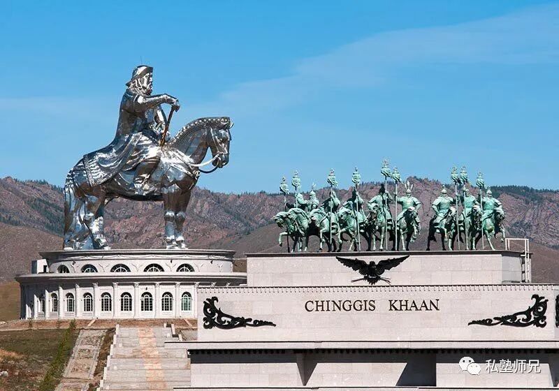 广场北有成吉思汗纪念碑,正中是成吉思汗的铜坐像,左侧和右侧分别是忽必烈和窝阔台的铜坐像。纪念碑的后面是蒙古国的议会大厦。
