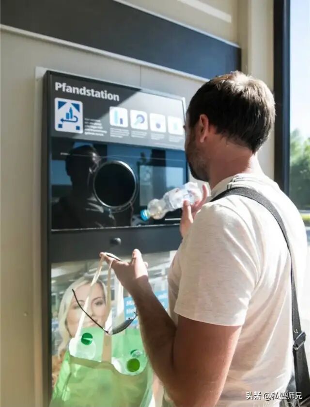3、德国大部分超市都有这样的一台设备,名字叫 塑料饮料瓶回收机 ,一个瓶子能抵价0.25欧元。需要购物车的话,得往购物车里面塞1欧元,锁就能打开,购物后把车按次序锁上,1欧元会自己吐出来。
